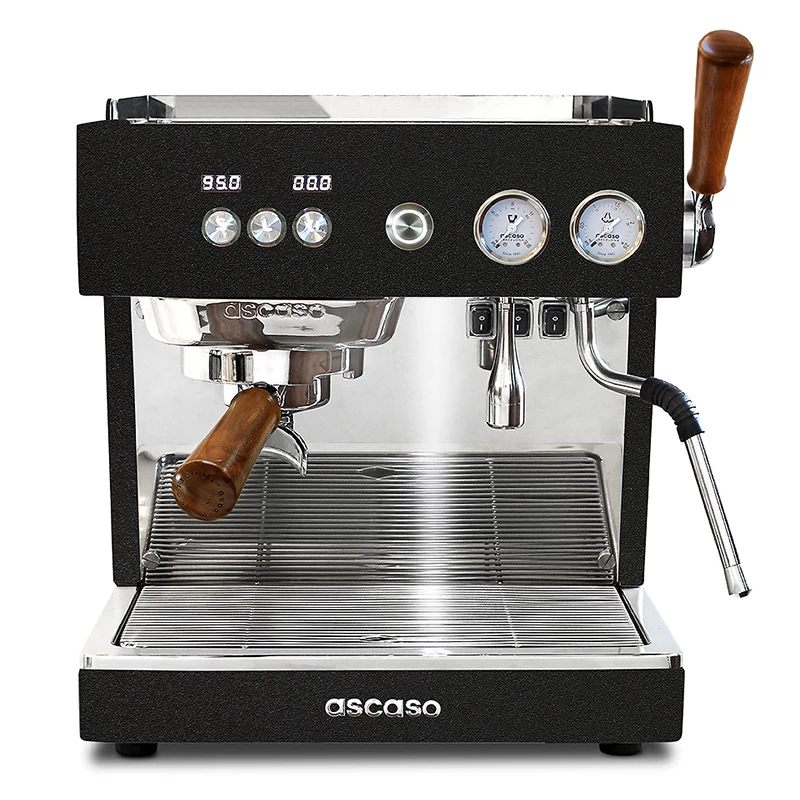 Die neue Ascaso Baby T Espressomaschine besticht sowohl durch die technischen Highlights, als auch durch das äußerst schöne Design. Die aufgeräumte und modern designte Front mit zwei Druckmanometern, den hintergrundbeleuchteten Portionstasten, einer digitalen Anzeige für die Brühtemperatur, sowie einer weiteren für die Brühzeit bietet in ihrer Einfachheit alles, was Sie für den perfekten Espresso benötigen. Ergänzt wird die optische Erscheinung durch Holzelemente am Siebträger sowie an dem Dampf-Joystick am rechten Rand der Maschine. Letzterer macht das Aufschäumen der Milch zu einem intuitiven Erlebnis, welches dank der no-burn und cool touch Dampflanze auch noch besonders komfortabel ist.