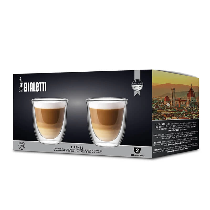 Das von Dichtern und Epochen gefeierte Florenz diente Bialetti als Inspiration zur Entwicklung der doppelwandigen Thermogläser. Der Glanz der künstlerischen Stadt spiegelt sich in dem 2er-Set wider. Isoliert wird die Wärme durch das doppelwandige Borosilikatglas, dadurch wird zudem ein Verbrennen der Hände vermieden und das Getränk bleibt schön warm.