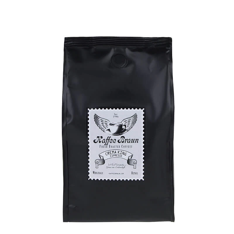 Der Crema King ist extra dunkel geröstet, wodurch er sich intensiv, würzig und vollmundig in der Tasse präsentiert. Der Espresso schmeckt nach dunkler Schokolade, begleitet von Walnuss- und Vanillenoten. Als Zubereitung eignet sich am Besten die Siebträgermaschine, um die Beste Crema zu erzielen. Doch auch der Vollautomat und die traditionelle Mokkakanne erzielen köstliche Ergebnisse mit den Bohnen des Crema King’s.