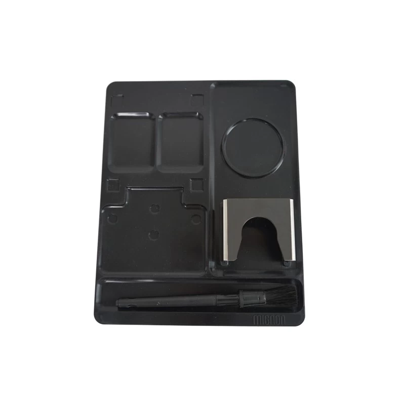 Mit dem Eureka Mignon Mat Kit ist es besonders einfach, die heimische Kaffeebar ordentlich zu halten. Die Silikonmatte dient als Stellfläche für Eurekas Mignon Mühlen und weiteres Zubehör. Vertiefungen im Silikon markieren die prädestinierten Parkplätze für die einzelnen Stationen. In der hinteren linken Ecke findet die Mühle sicheren Halt und bleibt dank der passenden Vertiefung stets perfekt zur Matte ausgerichtet stehen. Vor der Mühle bleibt reichlich Platz, um zum Beispiel einen Dosierbecher abzustellen. In der hinteren rechten Ecke ist ein runder Parkplatz für den Tamper vorgesehen. Vorne rechts sind Schlitze eingearbeitet, in die die mitgelieferte Tamperstation gesteckt werden kann. Sie bietet nicht nur stabilen Halt beim Tampen, sondern schützt auch den Siebträger und vor allem auch die Arbeitsplatte. Im vorderen Bereich ist eine Art Graben eingelassen, welcher als Ablageplatz für den mitgelieferten Pinsel geeignet ist.