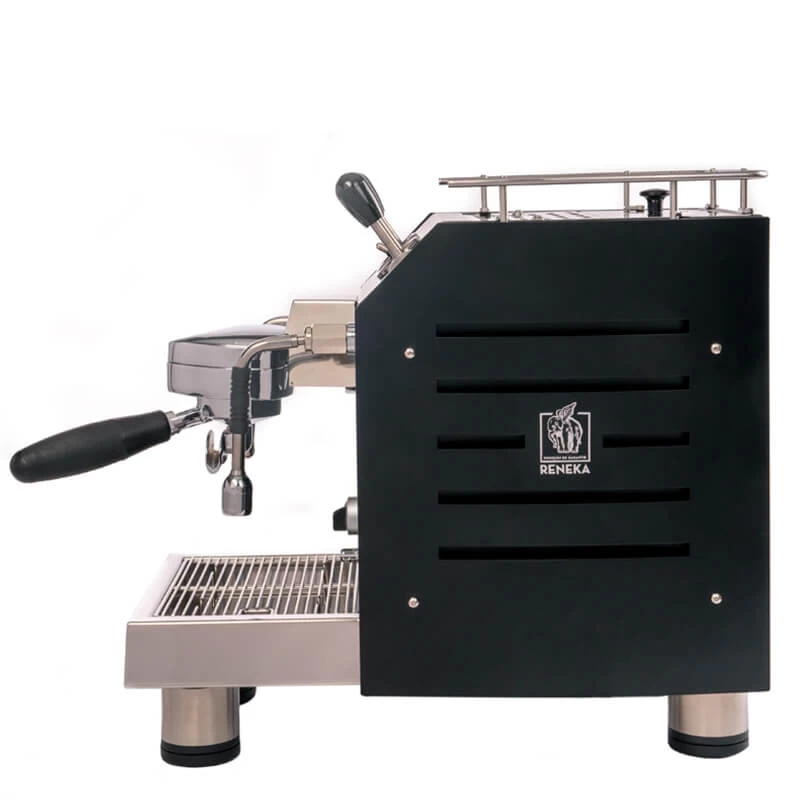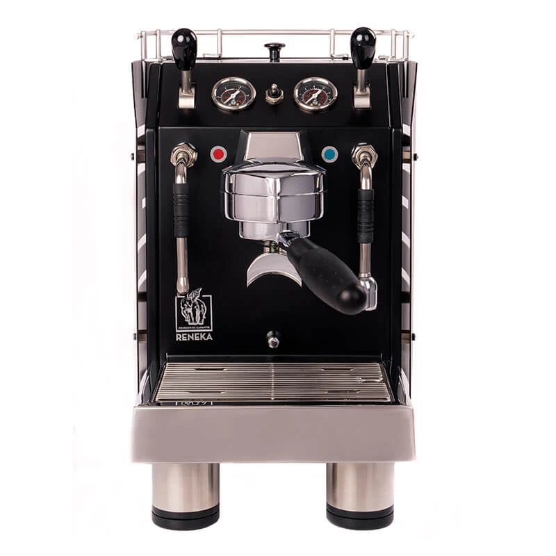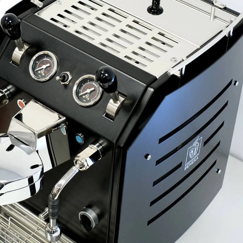 Die Family Home 1G vom französischen Hersteller Reneka ist zwar im Kern eine Zweikreiser Siebträgermaschine, setzt sich jedoch sowohl im Design, als auch technisch von vergleichbaren Maschinen ab. Auf den ersten Blick fällt das extravagante Design auf, entworfen von Alexander Schulz. Mit den geschwungenen Panels an den Seiten, ihren großen Füßen und der abgeschrägten Leiste mit den großen Bedienelementen und Manometern strahlt die Maschine von Reneka Extravaganz aus. Vor allem durch die Hebel und Instrumente in Kombination mit der Tassenreling erinnert die Family Home 1G an eine Motoryacht oder Flugzeug. Technisch begeistert die Family Home vor allem mit der einzigartigen Brühgruppe, welche selbstständig das Tamping übernimmt.