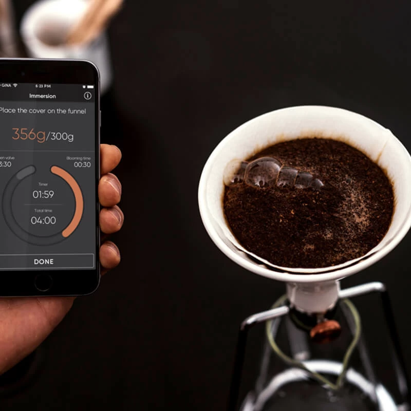 Um die vielfältigen Features des GINA coffee makers optimal nutzen zu können wurde in den Boden eine Waage integriert. Diese lässt sich via Bluetooth mit dem Smartphone und der GINA App verbinden. So ermöglicht die App die Überwachung der wichtigsten Parameter für eine optimale Extraktion auf einen Blick. Außerdem bietet die App nutzerfreundliche Schritt-für-Schritt-Brühanleitungen.
