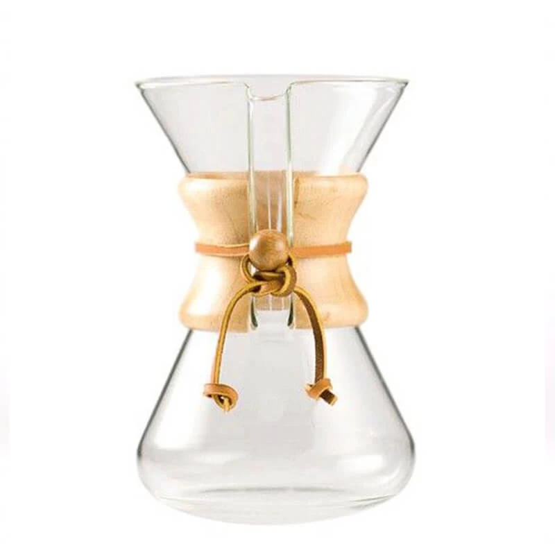 Die Kaffeezubereitung mit der einzigartig designten Chemex Kaffeekaraffe ist nicht nur stilvoll, sondern auch ein echter Genuss. Das Zubereitungstool ist aus hochwertigem und hitzebeständigem Borosilikaglas gefertigt und wird von einer Holzmanschette geschmückt, wodurch die Handhabung maßgeblich erleichtert wird. Genau wie bei herkömmlichen Handfiltern wird der Kaffee mit der Chemex aufgebrüht Die Besonderheit dieser Kaffeekaraffe ist die stilvolle Art zu servieren. Edel und auffällig wird der Kaffee direkt aus der Chemex serviert.