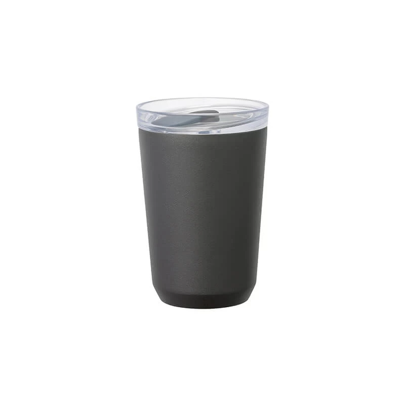 Der To-Go-Becher aus Edelstahl von Kinto ist in einer doppelwandigen Bauweise mit Vakuum gefertigt. Dadurch wirkt er isolierend und hält Getränke längere Zeit auf der gewünschten Genusstemperatur – egal ob kalt oder heiß. Nach unten wird der Becher schmaler, was sich im Alltag als besonders praktisches Design erweist. Der Becher passt bequem in die üblichen Getränkehalterungen. Darüber hinaus lassen sich dank der konischen Form mehrere Kinto Becher sicher und platzsparend gestapelt verstauen. Die hochwertige Pulverbeschichtung in Schwarz verleiht dem Edelstahlbecher ein besonders edles Aussehen. Die matte Textur der Oberfläche liegt besonders angenehm in der Hand. Die große Version mit 360 ml Füllvolumen bietet ausreichend Platz für wirklich große Portionen Filterkaffee, Cold Brew oder Milchmischgetränke wie einen Latte Macchiato. Die Höhe ohne Deckel beträgt 117 mm.