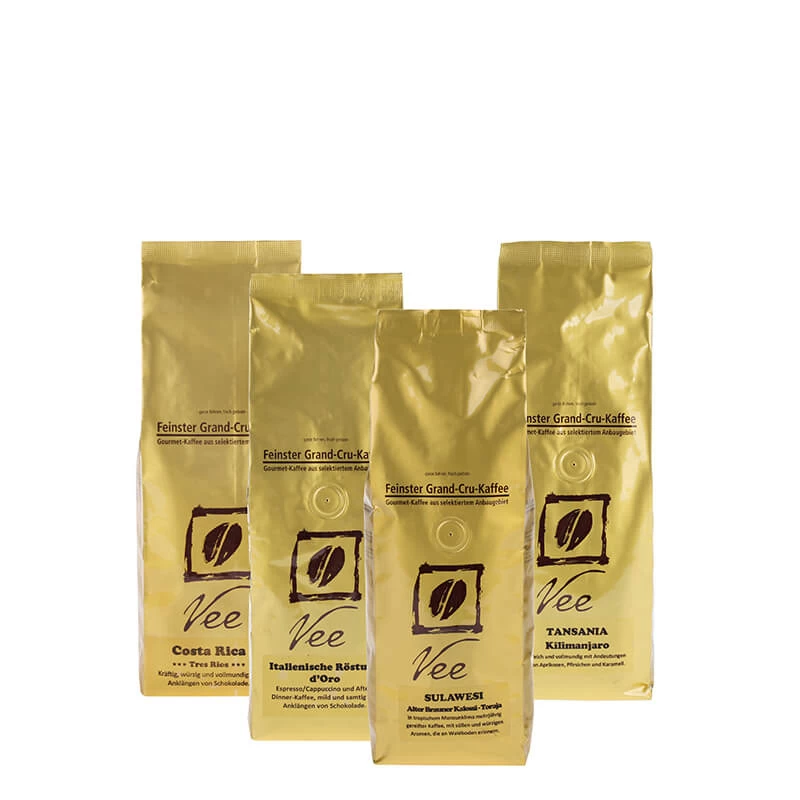 Dieses Probierpaket mit vier Spitzen Grand-Cru Arabica-Espressokaffees von Vee’s Kaffee bietet Ihnen die Möglichkeit, selbst nach Herzenslust zu probieren und Ihren persönlichen Favoriten zu finden.